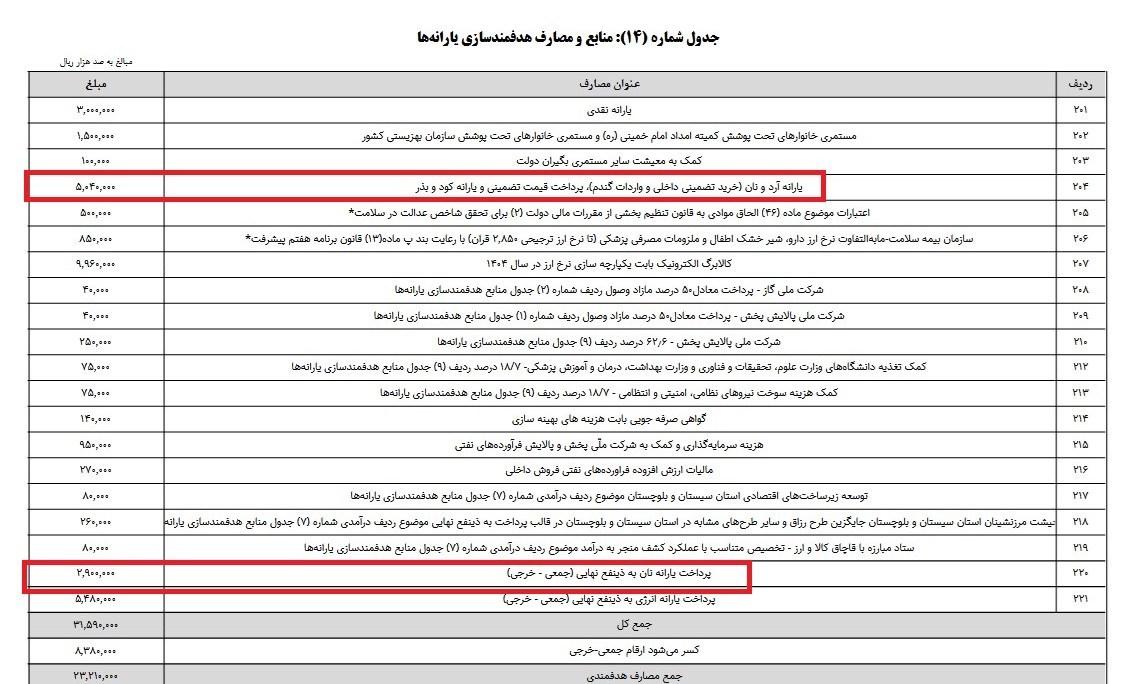 در جدول 14 حدود 290 همت منابع و به همان میزان مصارف برای پرداخت یارانه نان به «ذینفع نهایی» در نظر گرفته شده است. اما مشخص نشده که:آیا ذینفع نهایی، نانواییها هستند و این منابع همچنان در قالب یارانه آرد یا مابهالتفاوت قیمت به آنها پرداخت خواهد شد؟