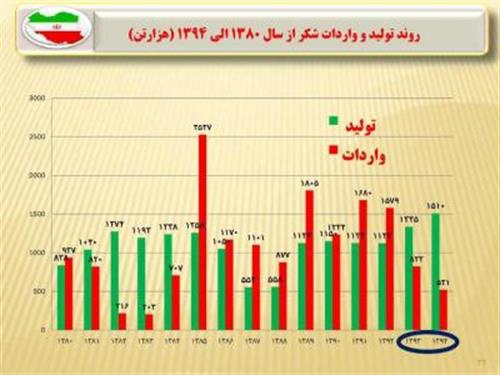 همچنین با اعمال سیاست های ممنوعیت واردات در راستای سیاست های اقتصاد مقاومتی، میزان واردات شکر از یک میلیون 579 هزارتن در سال 92 به 521 هزارتن در سال 94 کاهش یافته است.